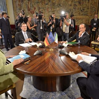 Una vez en el interior del recinto, los cuatro líderes europeos se sentaron en torno a una mesa redonda, en la que Rajoy se sentó frente a Monti y quedó entre Merkel y Hollande.