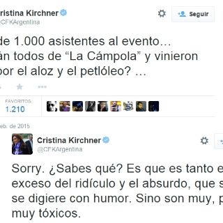 Después de este episodio, un segundo mensaje de la mandataria sudamericana se difundió a través del mismo espacio: "Sorry. ¿Sabes qué? Es que es tanto el exceso del ridículo y el absurdo, que sólo se digiere con humor. Sino son muy, pero muy tóxicos".