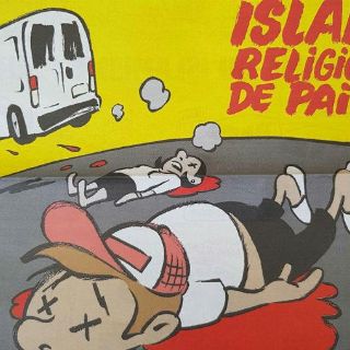 En la portada se pueden ver dos personas en el suelo con manchas de sangre y una furgoneta que las ha atropellado, que recuerda lo ocurrido en La Rambla, con el mensaje: "Islam religión de paz... eterna".