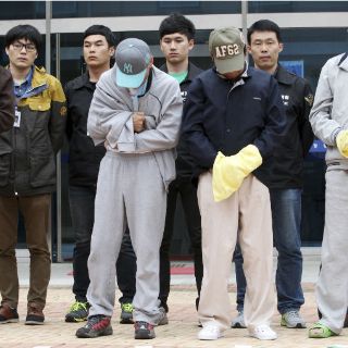 La televisión surcoreana transmitió el video de la policía escoltando a los cuatro hombres a la corte. Los cuatro se cubrieron el rostro con gorras de béisbol y al menos uno iba cojeando.