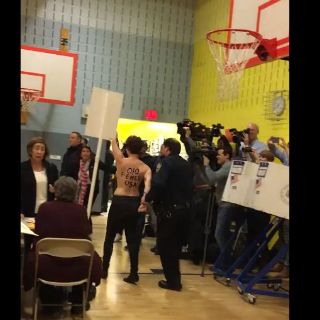 GUADALAJARA, JALISCO (08/NOV/2016) Dos mujeres miembros del movimiento Femen, han sido detenidas este martes luego de protagonizar una protesta en "topless" en contra de Donald Trump minutos antes de que el candidato republicano llegara a emitir su voto electoral.