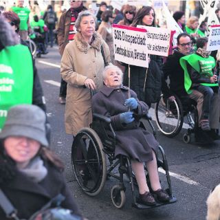 MADRID, ESPAÑA (03/DIC/2012).- Impedidos salen de sus casas a mostrar descontento. Personas discapacitadas se concentraron en Madrid para protestar contra las medidas de austeridad, especialmente la reducción de servicios, el cierre de centros de atención y el cese de los empleados de la salud por parte del Gobierno para reducir su abultada deuda soberana.