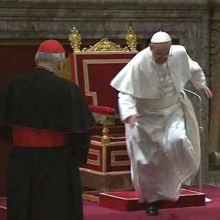 Al finalizar esa alocución, Francisco se encaminó a saludar al decano y al bajar los escalones trastabilló, estuvo a punto de caer pero logró mantenerse en pie. Luego, sin problemas, saludó al cardenal y volvió a su lugar.