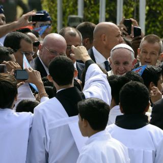 Algunos monaguillos que aguardaban en la pista se acercaron al Papa, quien aceptó tomarse unas fotografías con ellos.