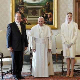 La princesa y el Papa vistieron de blanco. Charlene vistió un simple y elegantemente adaptado abrigo blanco, guantes blancos y tacones altos en color beige, mientras Francisco llevaba su atuendo de costumbre.