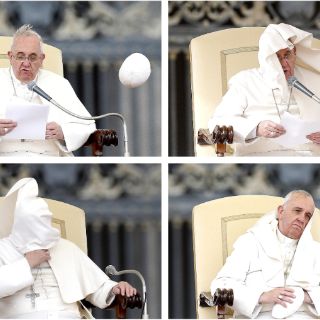 Su vestimenta habitual cayó en un acto de rebeldía que dejó al pontífice en pleno estado de incomodidad, especialmente cuando se le voló el solideo que cubre su cabeza en medio de una audiencia general.