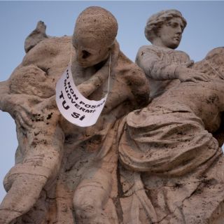 Algunas de las estatuas envían mensajes pesimistas como "Game Over" (se acabó el juego), enigmáticos como "Si telefoneando... pudiese decirte adiós" y directos como "El cuerpo de Italia no está en venta", en alusión al escándalo sexual que afecta a Berlusconi, conocido como caso Ruby, en el que es investigado por un presunto delito de concusión y de incitación a la prostitución de menores.
