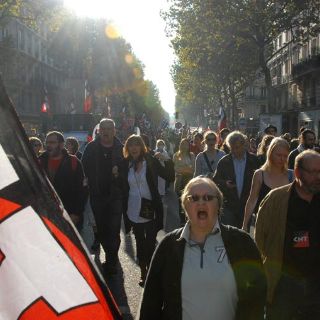 PARÍS, FRANCIA (14/OCT/2010).- Manifestantes marchan cerca de La Bastilla, en protesta contra el presidente francés Nicolas Sarkozy, y su plan de elevar la edad del retiro hasta 62 años, en París, Francia. El Gobierno francés excluyó cualquier concesión sobre la reforma al sistema de retiros, contra la cual las protestas se han radicalizado con la prolongación de huelgas en varios sectores, a las que se suma la iniciada por empleados de refinerías.