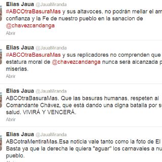 "ABC otra basura más. Que las basuras humanas respeten al Comandante Chávez, que está dando una digna batalla por su salud. Vivirá y vencerá", precisó el canciller venezolano.