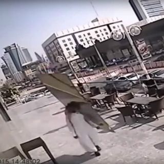 CIUDAD DE MÉXICO (25/SEP/2015).- Un hombre en Arabia Saudita se libró milagrosamente de un accidente que pudo ser fatal luego de que cayera sobre él un panel de vidrio desde lo alto de un edificio, suceso que quedó registrado por cámaras de videovigilancia.