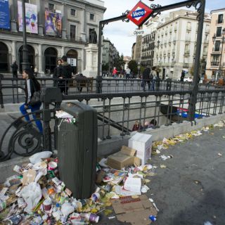 Frente a la elegante fachada del Teatro Real, sede de la Ópera de la capital española, todo tipo de desechos se amontonaban sobre las aceras, al pie de las papeleras y a la salida del metro, ante la mirada resignada de los viandantes.