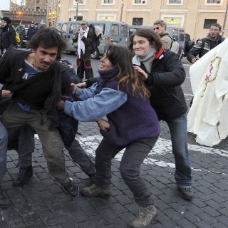 CIUDAD DEL VATICANO (14/ENE/2012).- Varias decenas de "indignados" procedentes de varios países, entre ellos España y Francia, se manifestaron sorpresivamente el día de hoy en la Plaza San Pedro del Vaticano, gritando "libertad" y "no a la violencia", y también "Iglesia corrupta y "Papa criminal", constató la AFP.