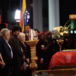 Morales estuvo en la parte final del periplo del féretro de Chávez, un recorrido de 8 kilómetros y más de seis horas que recorrió las calles de Caracas desde el hospital hasta la Academia Militar.