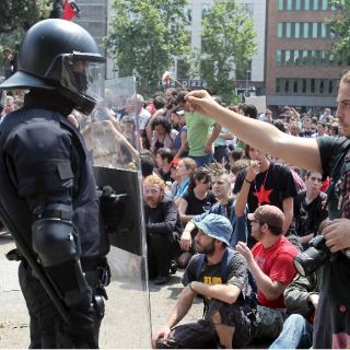 Si bien la actitud y consigna de los manifestantes era de presentar una "resistencia pacífica", los ánimos se caldearon cuando una quincena de camiones municipales de la limpieza quisieron abandonar la plaza.
