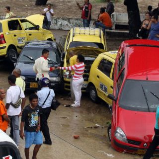 BARRANQUILLA, COLOMBIA (16/MAY/2011).- En la imagen, curiosos y afectados rodean y observan una fila de autos encimados por una inundación en Barranquilla, Colombia. Sesenta automotores y más de cincuenta tiendas resintieron el efecto de la lluvia, reforzado por el fenómeno “La Niña”.