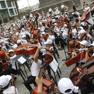 Ubicados en la céntrica Plaza de la Independencia de la capital uruguaya y bajo un cielo encapotado que amenazaba con lluvia -la cual provocó que la función, prevista para este martes, fuese retrasada para hoy- los jóvenes interpretaron, entre otras, el "Himno a la Alegria" de Beethoven y la "Danza Rusa" de Tchaikovsky.