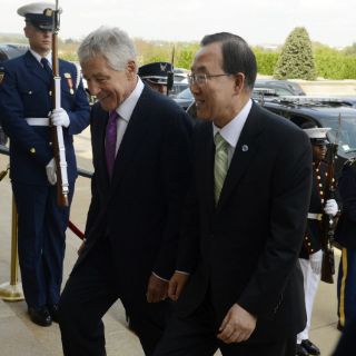Ban fue recibido por una guardia de honor antes de conversar por 30 minutos con el secretario de Defensa, Chuck Hagel, y el jefe del Estado Mayor Conjunto, el general Martin Dempsey.