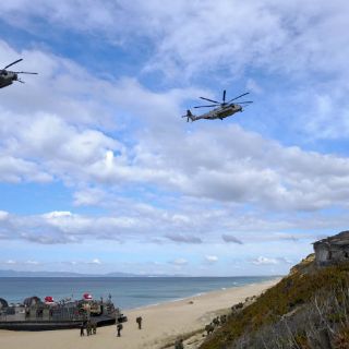 Enormes aerodeslizadores de la Armada estadounidense llegaron desde el buque Arlington, a unos 100 kilómetros al sur de Lisboa y depositaron en las playas infantes de marina estadounidenses y portugueses y vehículos blindados, mientras helicópteros de la Armada sobrevolaban el lugar.