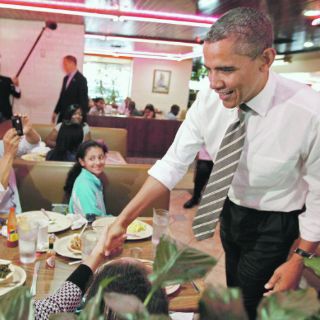 El lunes, el presidente convivió con varios seguidores en un restaurante de Los Ángeles, donde ordenó alitas de pollo para llevar (imagen).