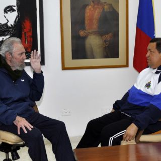 Chávez, de 57 años, llevaba un atuendo deportivo con las insignias y los colores azul, blanco y negro de la Academia Militar de Venezuela, mientras Fidel lucía una chamarra deportiva con una franja blanca del hombro al codo. Ambos estaban sentados y al fondo aparecen pinturas de los próceres José Martí, de Cuba, y Simón Bolívar, de Venezuela.