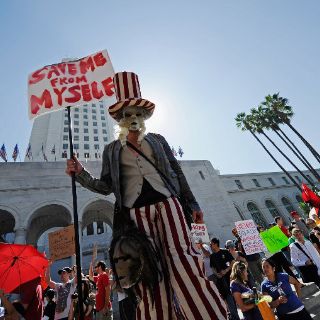 En Los Angeles los manifestantes caminaron de forma pacífica hacia la alcaldía local con pancartas en contra de las corporaciones y exigiendo más derechos para los ciudadanos, así como un cambio en el clima económico de la nación.