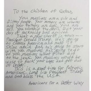Las misivas, dirigidas a los "hijos del Satanás", descargan insultos contra el Islam y aseveran que Trump "va a limpiar a Estados Unidos y devolverle su esplendor", denunciaron los responsables de la Asociación Cair en California (oeste), al reclamar más protección policial alrededor de las mezquitas.