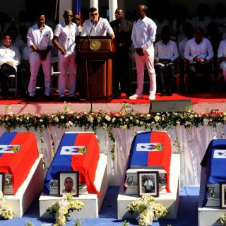 Féretros blancos cubiertos con la bandera haitiana estaban colocados en la parte delantera de un escenario donde funcionarios del gobierno, incluso el presidente Michel Martelly y el primer ministro Evans Paul, recibieron a familiares y amigos de las víctimas.