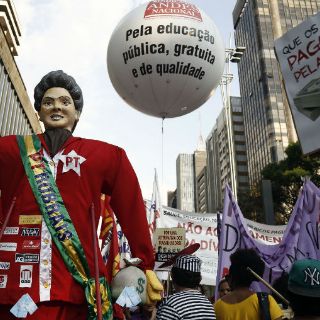 Encabezados por dos muñecos de cartón que representaban a Rousseff y al líder de la oposición -el socialdemócrata Aécio Neves-, los manifestantes clamaron no sólo contra el gobernante Partido de los Trabajadores (PT), en el poder desde hace 12 años, sino también contra los movimientos opositores de la derecha.