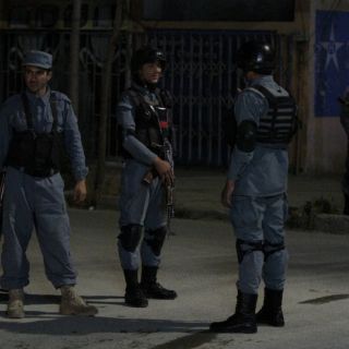 Policías afganos hacen guardia cerca del Hotel Park Palace tras un ataque de militantes talibanes, en Kabul, Afganistán.