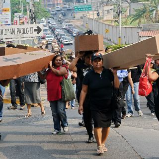 Honduras, cargando ataúdes de cartón, contra los femicidios que permanecen impunes pese a haberse incluido el delito en el Código Penal hace un año.