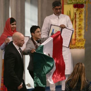 Este joven se paró delante de los dos galardonados, la paquistaní Malala Yousafzai y el indio Kailash Satyarthi, y les pidió que hablasen de México agitando una bandera de su país simbólicamente manchada de rojo.