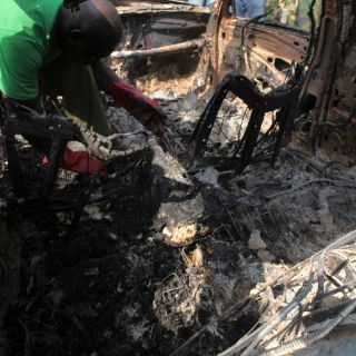 Afuera de la iglesia de Santa Teresa, una multitud se reunió entre los automóviles quemados en el estacionamiento sin pavimentar, furiosa por el ataque que se adjudicó la secta musulmana radical Boko Haram y temerosa de que el grupo agreda otros templos.