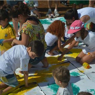 Embadurnados de azul, verde y amarillo, los niños pintaron con sus manos y pies una bandera gigante de Brasil.