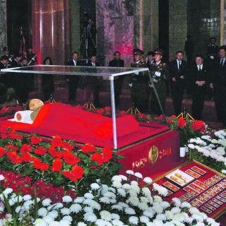 Fuera del Palacio Memorial, donde se encuentra el cuerpo embalsamado de Kim Il-sung, fundador del Estado y padre de Kim Jong-il, los norcoreanos colocan guirnaldas bajo una enorme fotografía del fallecido líder.