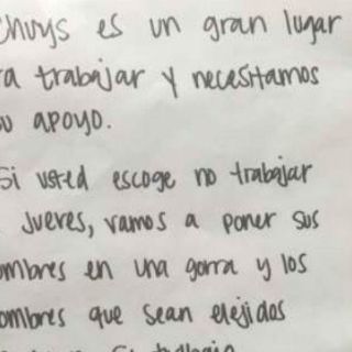 La nota, escrita en español, aparentemente fue publicada en el área de empleados del restaurante: “Chuy's es un gran lugar para trabajar y necesitamos su apoyo. Si usted escoge no trabajar el jueves, vamos a poner sus nombres en una gorra y los nombres que sean elejidos (sic), perderán sus trabajos”.