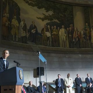 Obama habló en el National Archives Museum, donde inmigrantes de Iraq, Etiopia, Uganda y otros 22 países fueron juramentados como ciudadanos estadounidenses. Habló desde un podio al lado de una réplica de la constitución. Recordó que los primeros inmigrantes fueron los peregrinos y que ocho firmantes de la Declaración de Independencia eran inmigrantes.