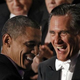 NUEVA YORK, ESTADOS UNIDOS (18/OCT/2012).- El presidente Barack Obama y su contrincante republicano Mitt Romney cambiaron momentáneamente los sarcasmos por las sonrisas este jueves, tras coincidir en la cena de la Fundación en Memoria de Alfred E. Smith, una velada de gala en Nueva York que ha sido una escala obligada para muchos políticos desde el término de la Segunda Guerra Mundial.