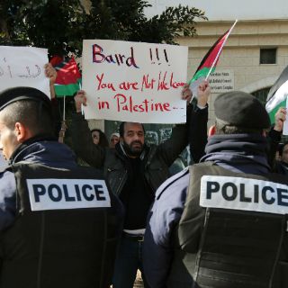 "Esta persona respalda el movimiento sionista", dijo el manifestante Abdalá Abu-Ramé. "Esta persona minimiza los derechos de nuestro pueblo y respalda la construcción de asentamientos. Le decimos que no es bienvenido".
