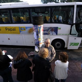 El bus avanza con dificultad por las calles estrechas del viejo barrio de Flores, uno de los más antiguos de Buenos Aires, y algunos vecinos saludan el paso del vehículo que porta en su frente el presuntuoso cartel de "Circuito papal".