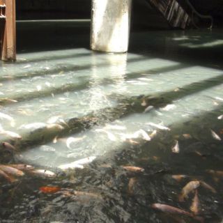 Nada más entrar en este pequeño recinto, centenares de coloridos peces acuden al borde del estanque para recibir su ración de sustento.