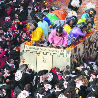 TURÍN, ITALIA (11/FEB/2013).- Cada año, miles de italianos se reúnen en Ivrea, cerca de Turín, en el Norte de Italia, para la pelea de naranjas más grande del mundo. La tradición forma parte del carnaval de la ciudad, que data de 1808 y cuyo tema principal es la libertad y la revolución. El festival es parte de la celebración contra el autoritarismo inspirada en las revueltas populares de la región contra los señores feudales en la Edad Media. Las personas que participan se dividen en grupos de carrozas y grupos de pie. Los de las carrozas —que representan a los señores feudales— se dedican a lanzar naranjas a los ciudadanos, quienes intentan “revelarse”.