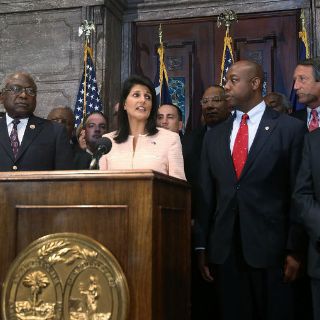 La gobernadora del estado, Nikki Haley, anuncia su decisión entre aplausos y vitores