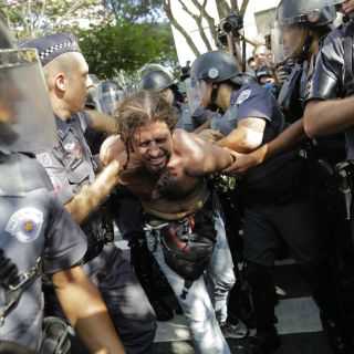 Cerca de 150 hombres de la Tropa de Choque de la Policía Militarizada del estado de Sao Paulo dispersaron a un grupo de 50 manifestantes que intentaba marchar por la avenida Radial Este, la principal vía de acceso al Arena Corinthians, el estadio de Sao Paulo en que se disputará el partido inaugural del Mundial.