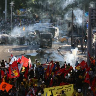 Al intentar marchar hacia Taksim, un grupo de la izquierda radical empezó a tirar botellas contra el cordón de los agentes, que reaccionaron lanzando gases lacrimógenos y cargando con sus porras.