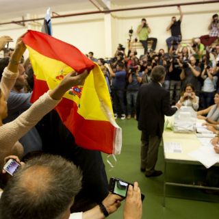 Al momento de quedar solo frente a la urna de la mesa U, Sección 57, Distrito 05, y a escasos metros suyos simpatizantes del conservador Partido Popular (PP) mostraron banderas españolas y alguna pancarta en contra del proyecto independentista de Mas.