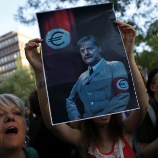"Una Europa alemana, no" y "Merkel go home" se podía leer en las pancartas que agitaban los manifestantes, algunos mostrando a una Angela Merkel con las mejillas pintadas con una cruz gamada.