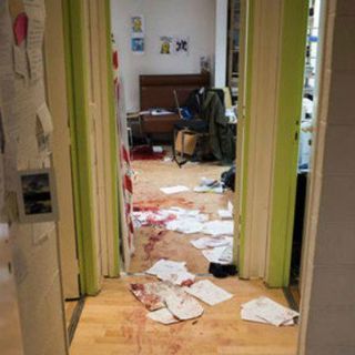 En la imagen, publicada por el diario francés Le Monde, fue tomada desde un pequeño pasillo, donde se pueden apreciar algunos documentos colocados en las paredes, pero también algunos tirados en el piso, desordenados entre manchas de sangre.