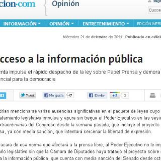 BUENOS AIRES, ARGENTINA (21/DIC/2011).- La Nación de Argentina, uno de los diarios más influyentes de ese país, dedicó su editorial para tratar un polémico proyecto que empuja el Ejecutivo para tomar el control sobre el papel periódico, lo que podría atentar, sostiene la publicación, contra la libertad de expresión y generar un clima de persecución de los medios impresos.
