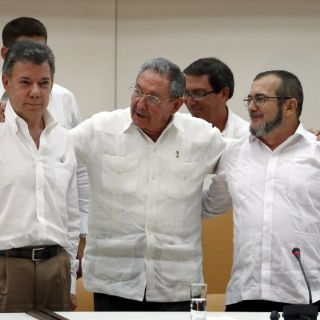 El mandatario cubano saludó y felicitó al presidente Juan Manuel Santos y al jefe máximo de las FARC, Rodrigo Londoño Echeverri "alias "Timoshenko", así como a sus equipos negociadores por los esfuerzos para lograr este acuerdo, el más importante que firman las partes en tres años de negociaciones en Cuba.