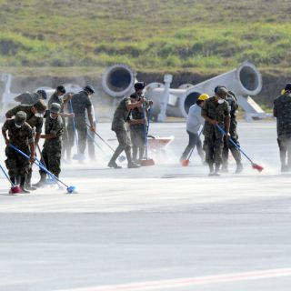 Miles de personas permanecieron varadas durante un día esperando que las autoridades limpiaran la pista de aterrizaje de la terminal, que fue cerrada a las 5:00 de la tarde del sábado. Cerca de 100 soldados participaron en las operaciones de limpieza barriendo la pista con escoba en mano.